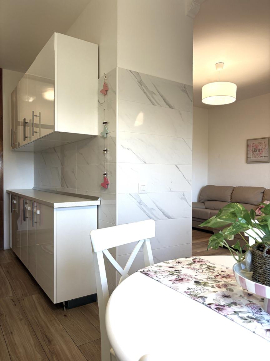 La zona living è composta da un’ampia e luminosa sala con accesso al balcone, perfetta per momenti di relax. La cucina abitabile e spaziosa è ideale per chi ama vivere la casa anche nei momenti conviviali. La zona notte ospita due camere da letto di generose dimensioni, un bagno finestrato dotato di ampio box doccia in cristallo e due pratici ripostigli.