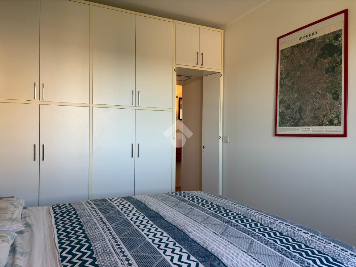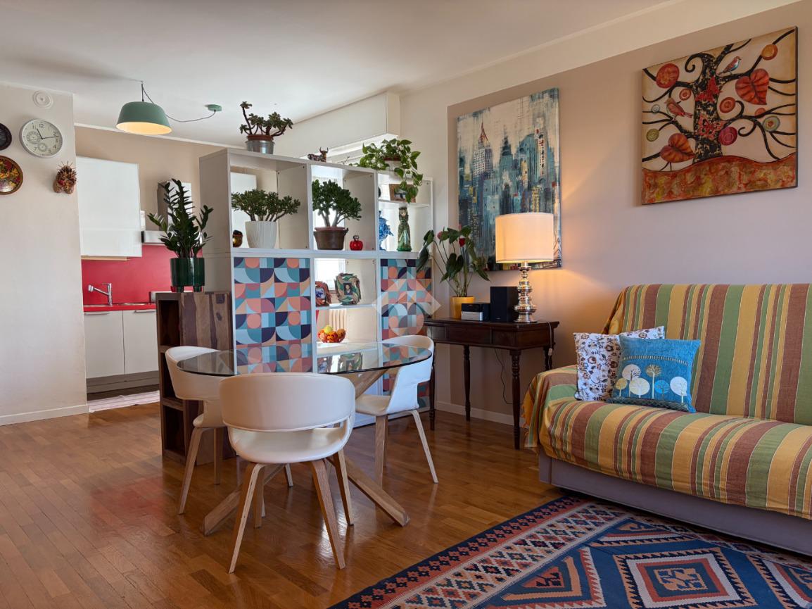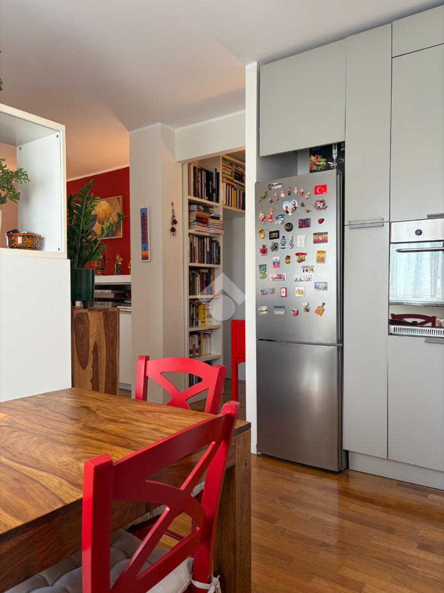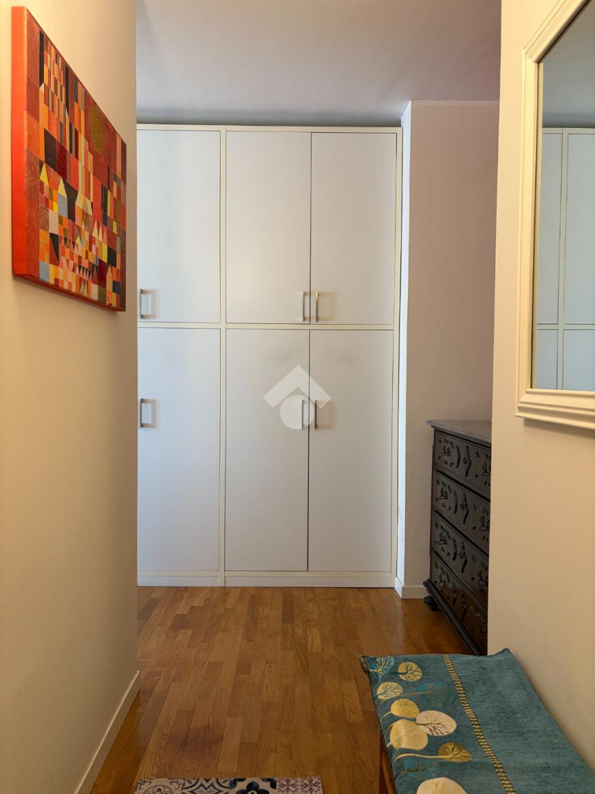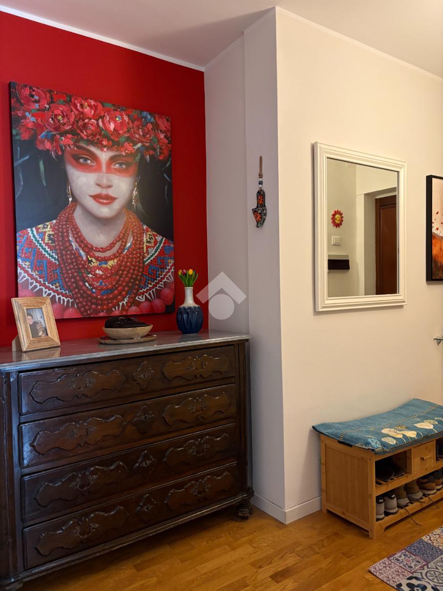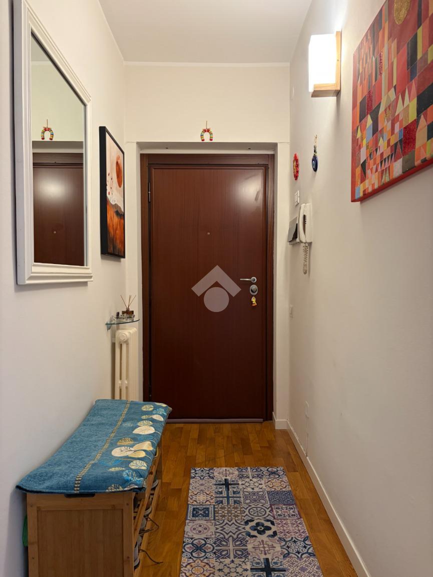L’appartamento si distingue per una distribuzione degli spazi funzionale e contemporanea: il disimpegno, accogliente e ben organizzato, è dotato di armadiatura guardaroba su misura, pensata per ottimizzare gli spazi. La zona living, luminosa grazie al suo affaccio ad ovest, si apre sul balcone, da cui si gode di una piacevole vista sul verde, creando un ambiente ideale per momenti di relax e convivialità. La cucina, integrata nel soggiorno ma dotata di autonomia funzionale, dona all'alloggio un taglio moderno mentre la zona notte ospita una camera matrimoniale confortevole. Il bagno finestrato è rifinito con box doccia in cristallo, dal design attuale.
